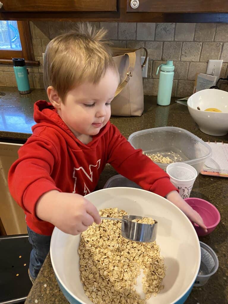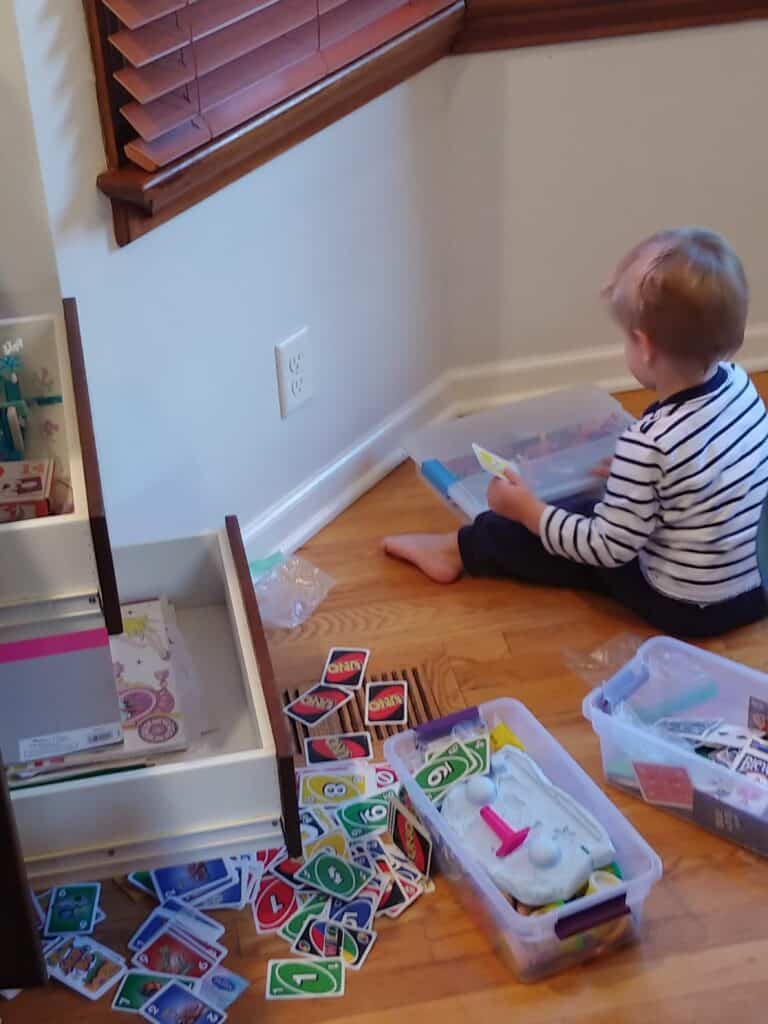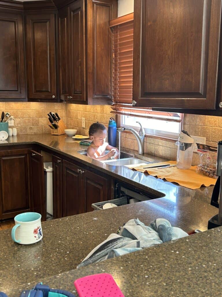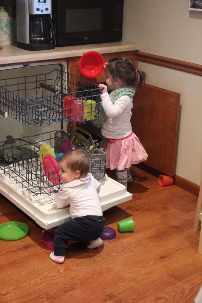 I let the toddler “help” unload the dishwasher. It’s quality time and keeps him right next to me while school is happening at the kitchen table.