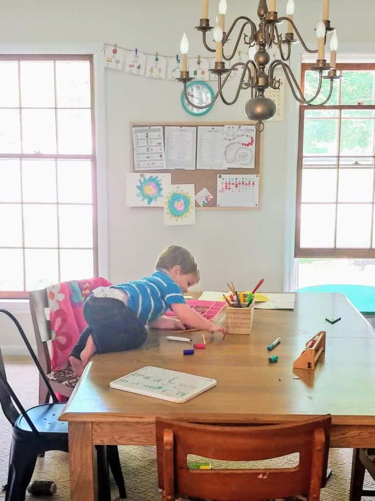 Don’t banish your toddler to a different room. They want to be near you and near their older siblings — that’s totally normal for young children. I set up a high chair or a little table with a toddler activity right next to where my big kids work in our living room. A coloring book, some board books, or a busy box goes a long way.
