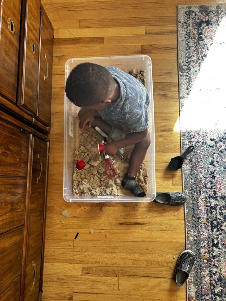 We use a shallow under-the-bed size bin with dried pasta — WAY easier to clean up than rice! I let the kids choose “real” kitchen tools. One time, we went to the dollar store and picked out items there!