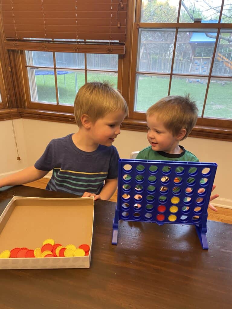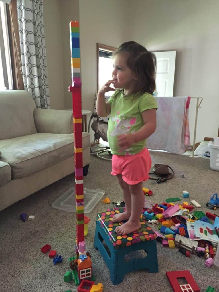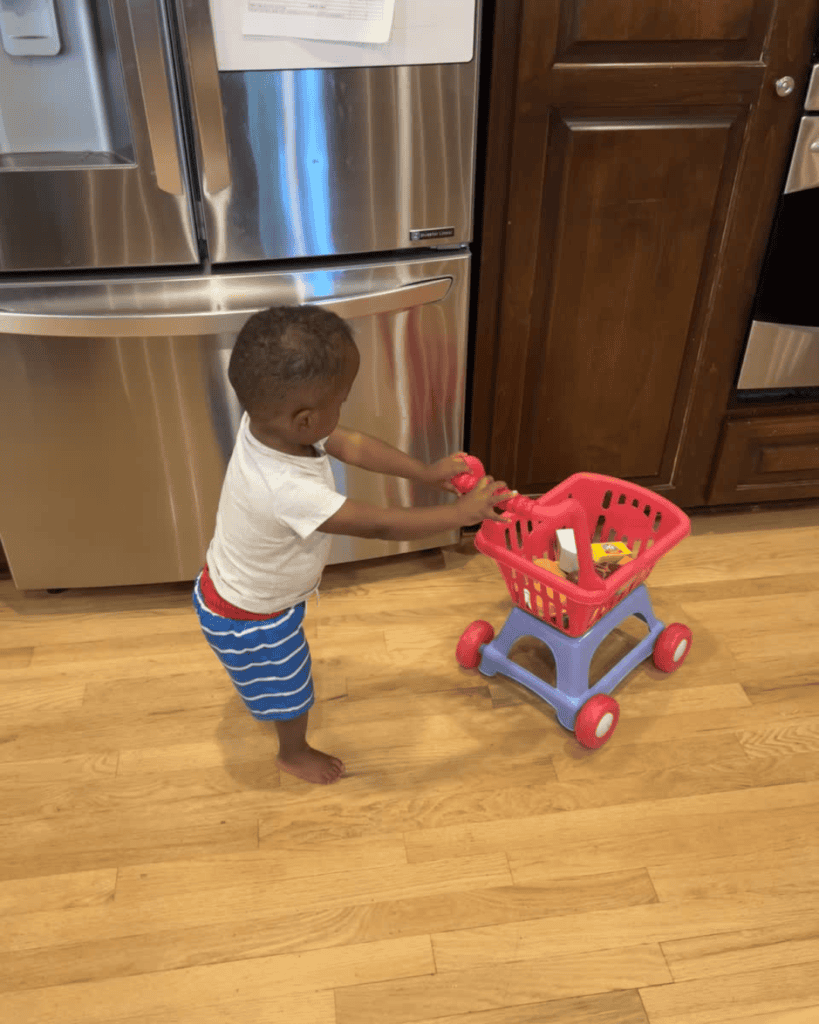 Toddlers love loading things up, pushing them around, and dumping them out. Repeat for 45 minutes. It’s a great way to keep them moving around the living room while you work with your big kids.