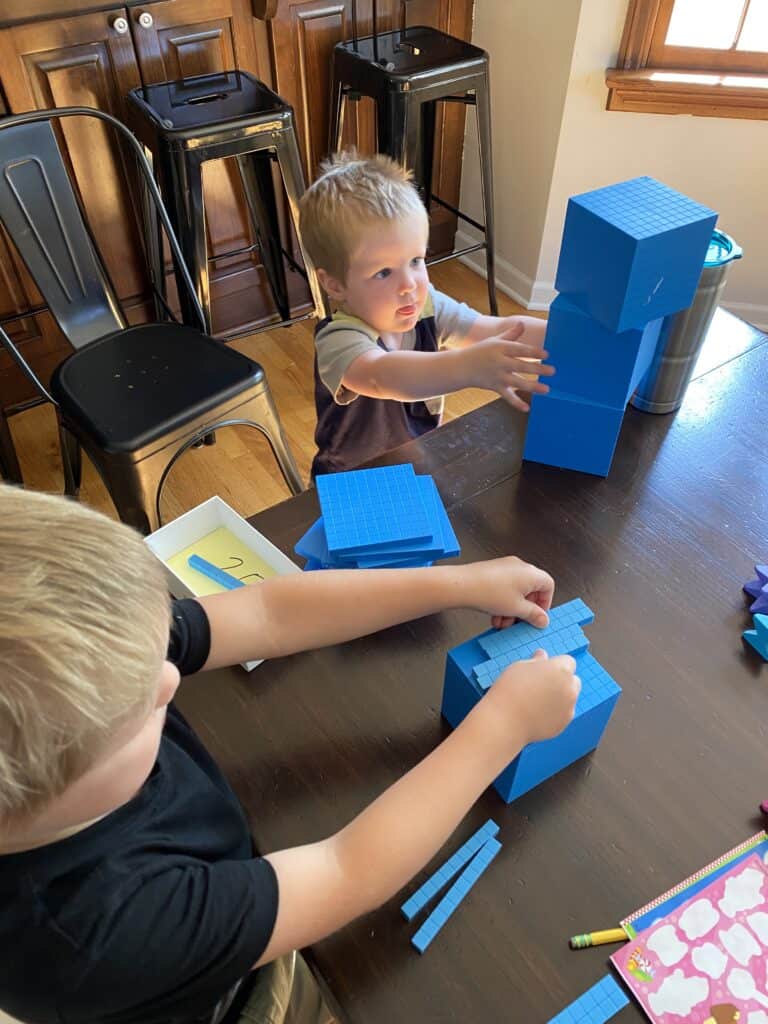 Our younger kids love playing with math manipulatives and school books materials that the big kids use. Our second daughter started recognizing shapes and different colors from playing with her older sister’s math manipulatives long before she started any formal school work.
