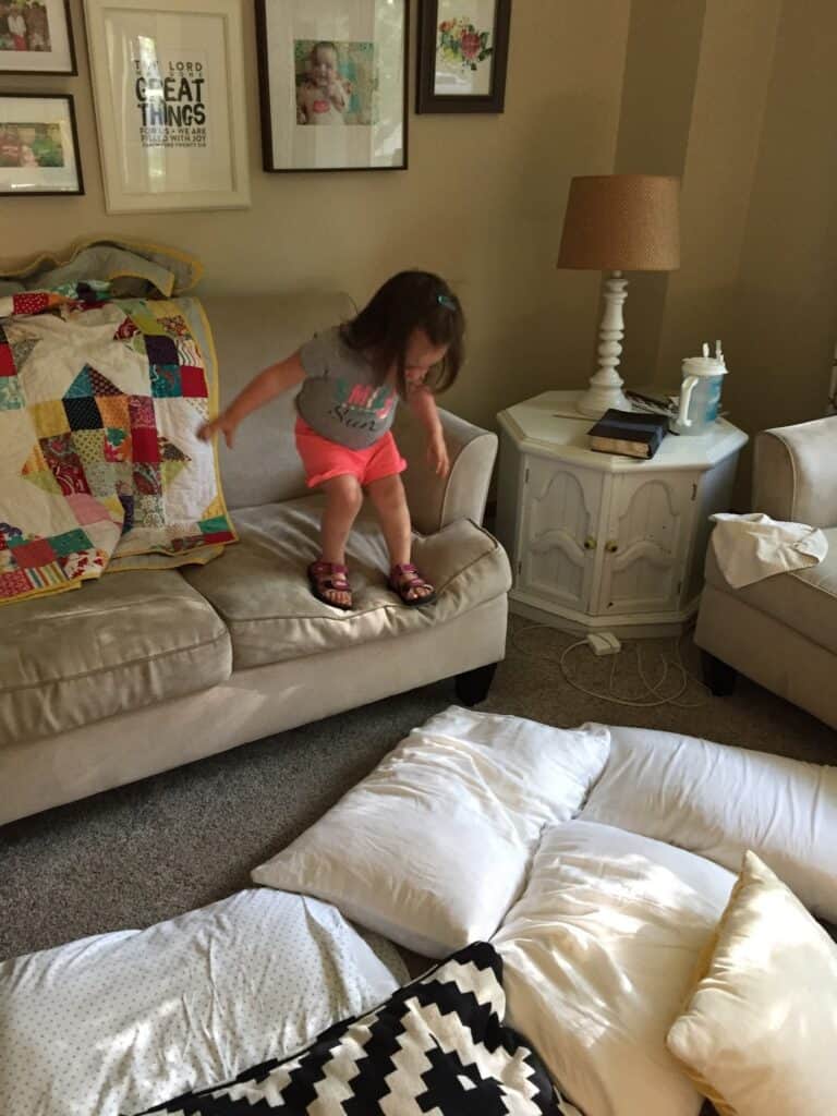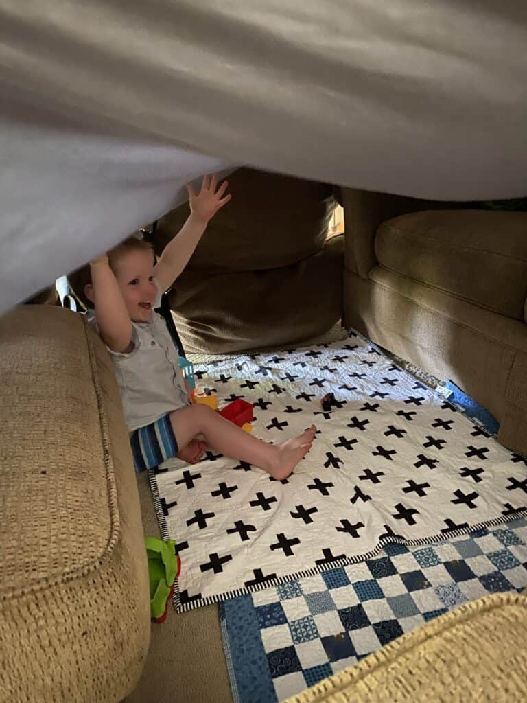 Couch cushions, pillows, and blankets spread out in the family room. This activity lasts longer with young children if you let them do it near you. Your older siblings might even join in during a school break!
