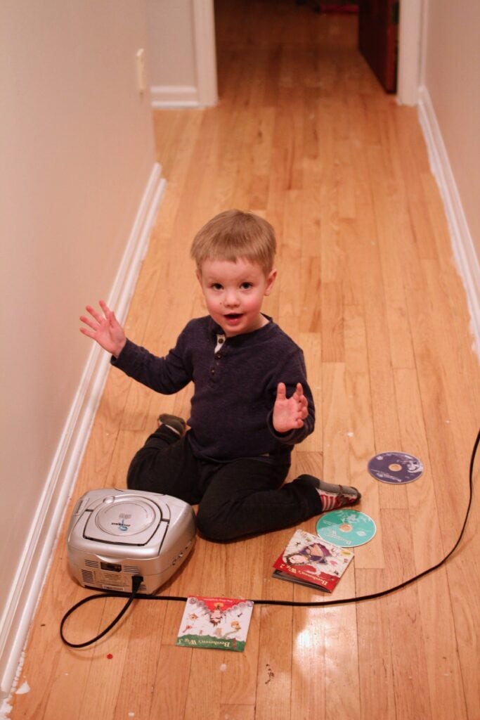He’s 3.5 years old in this picture! For a younger toddler, I’d put the CD player out of reach! Grandma had gifted the older fisher price one to our 2 year old once, and it was a huge hit.