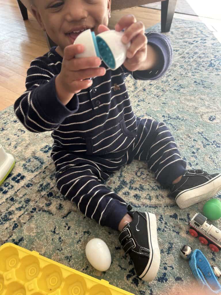 Our little people play with this egg match toy in lots of different ways for about 2 years — opening, closing, pulling the eggs apart, pairing up the different colors to match.