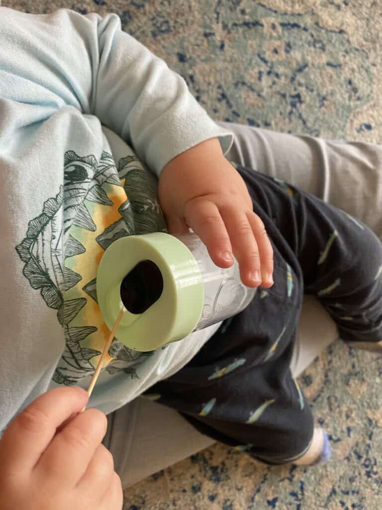 Recycle an old wipes container by letting your toddler push pom poms or cotton balls or other small pieces in and out. This is a favorite during school time at our house.