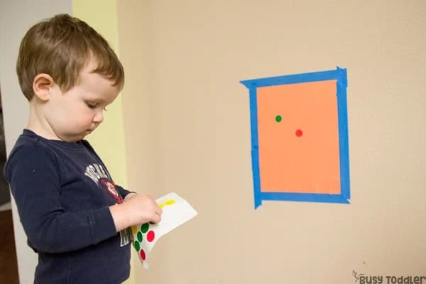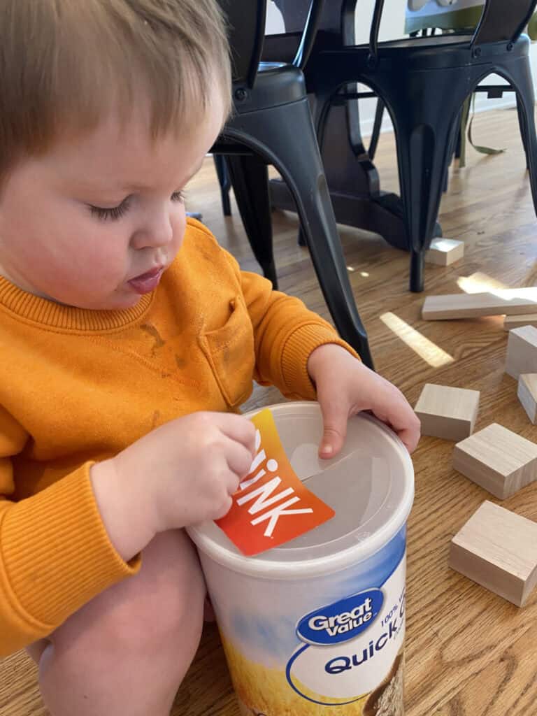 Cut a slit in the lid and show your toddler how to push cards through. Once it gets boring, put it away for a couple of weeks — it’ll be like a brand new activity.