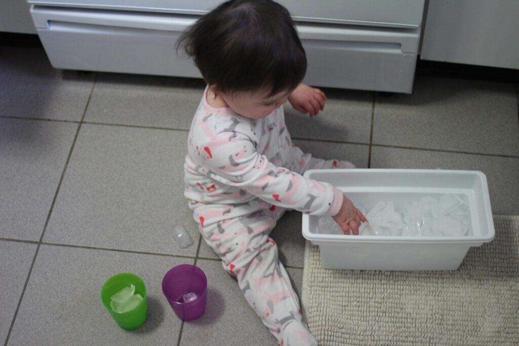 Just plain ice cubes in a bowl are endlessly entertaining for young children. Add food coloring and watch the different colors swirl.