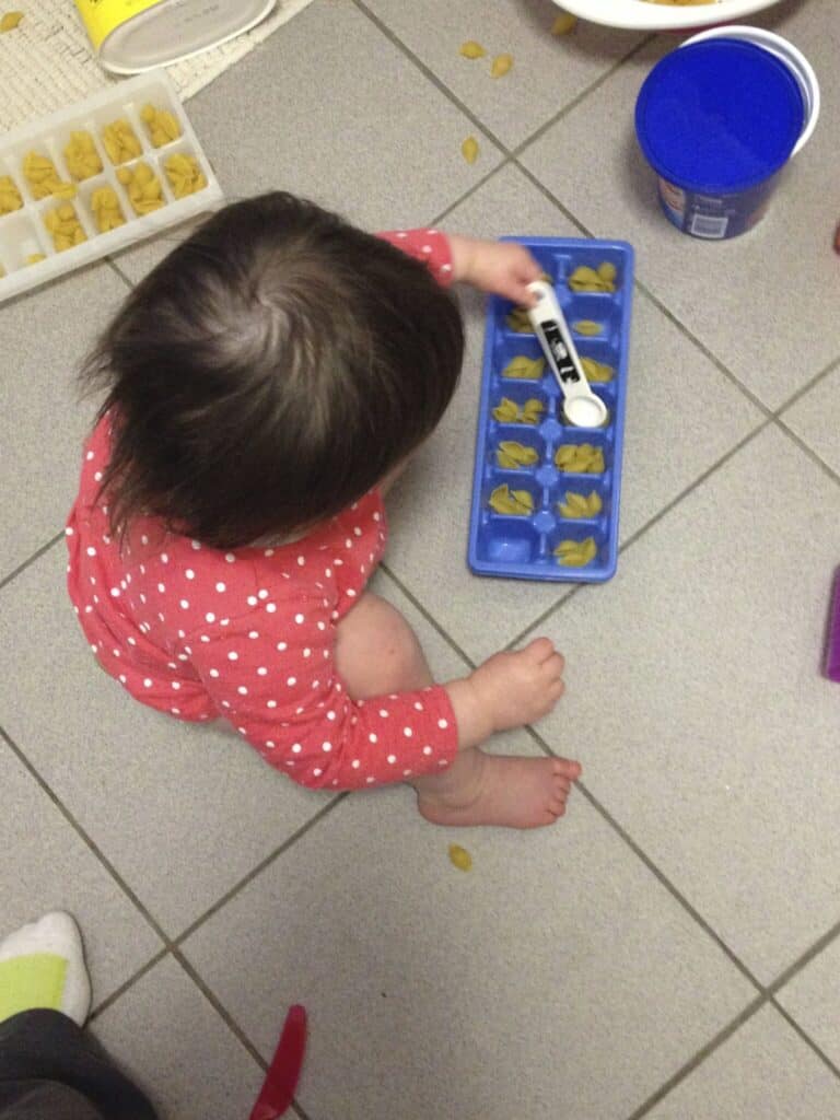 Let them go to town with small objects in pots and pans. For older toddlers, try math linking cubes or dried pasta. For younger kids, use larger objects like blocks. Muffin tins are perfect for sorting different colors of items.