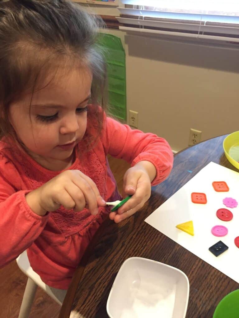 Perfect for fine motor skills practice. Anything that requires little hands to pinch is a great way to build fine motor skills. This is much fun for a surprisingly long time.