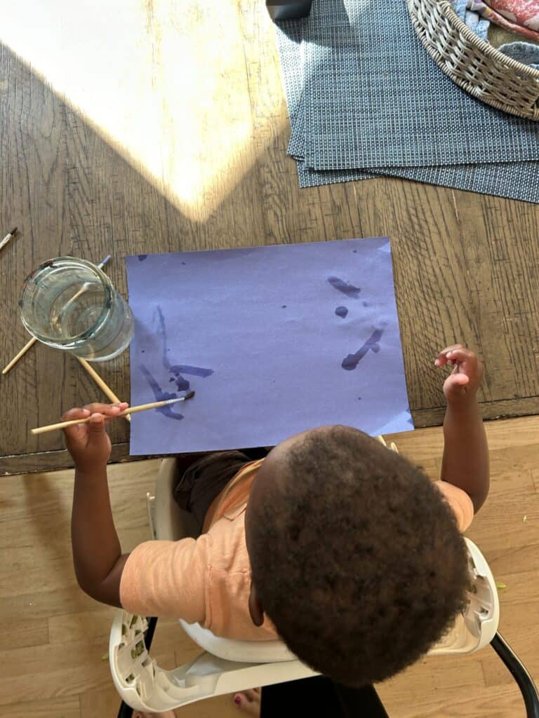 Q tip painting is SO good for little fingers! Let kids dab “stars” onto black paper or make “leaves” on a tree drawing. Little stamps of color all over the page.