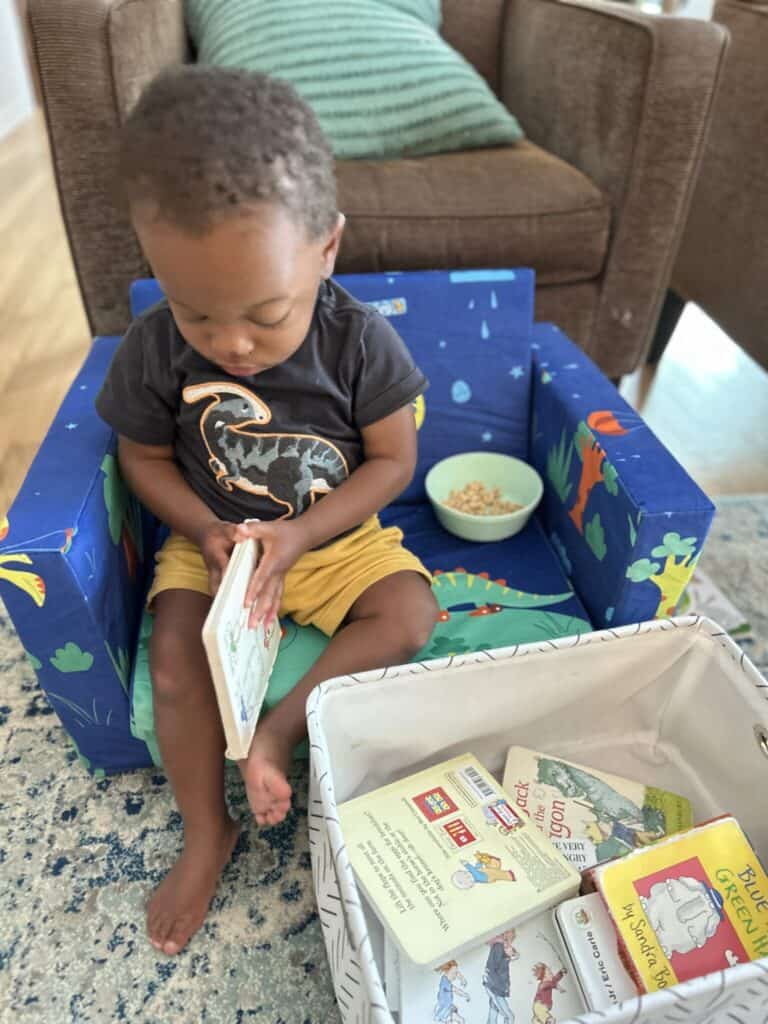 One and 2 year olds love things to be their own size. Our little guy loves to sit in this special chair with a basket of board books and a snack. Even your youngest child benefits from being surrounded by favorite books.