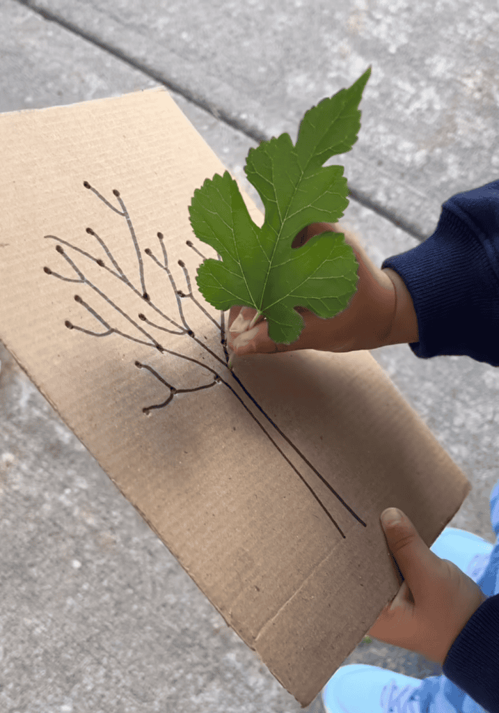 Draw a tree on cardboard, poke holes in it, and take your child leaf hunting. A great one for a field trip to the backyard!