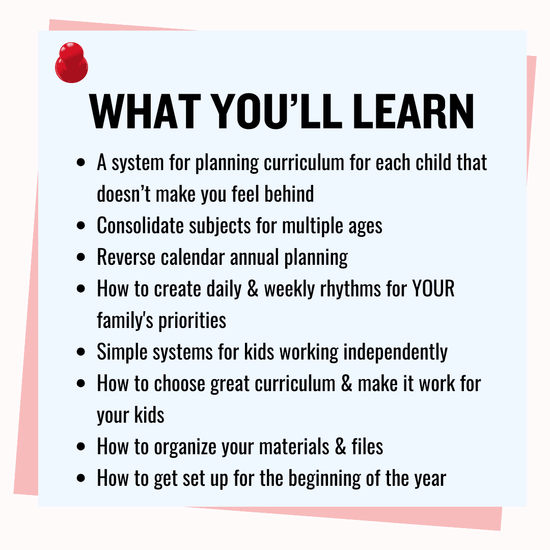 This course will simplify everything related to homeschool planning for you. There are a small handful of very short videos with super actionable steps to take. It will work for you no matter your homeschooling personality or style.